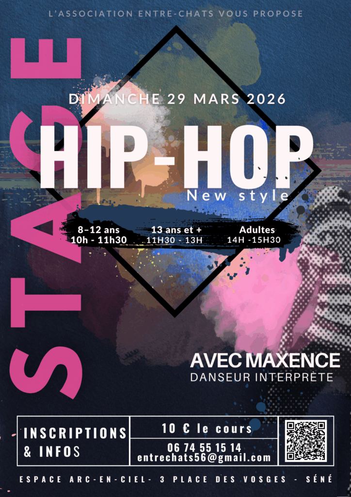 L’association Entre-chats vous propose un stage de Hip-Hop New style avec Maxence, dimanche 29 mars 2026, à l’Espace Arc-en-Ciel de Séné :